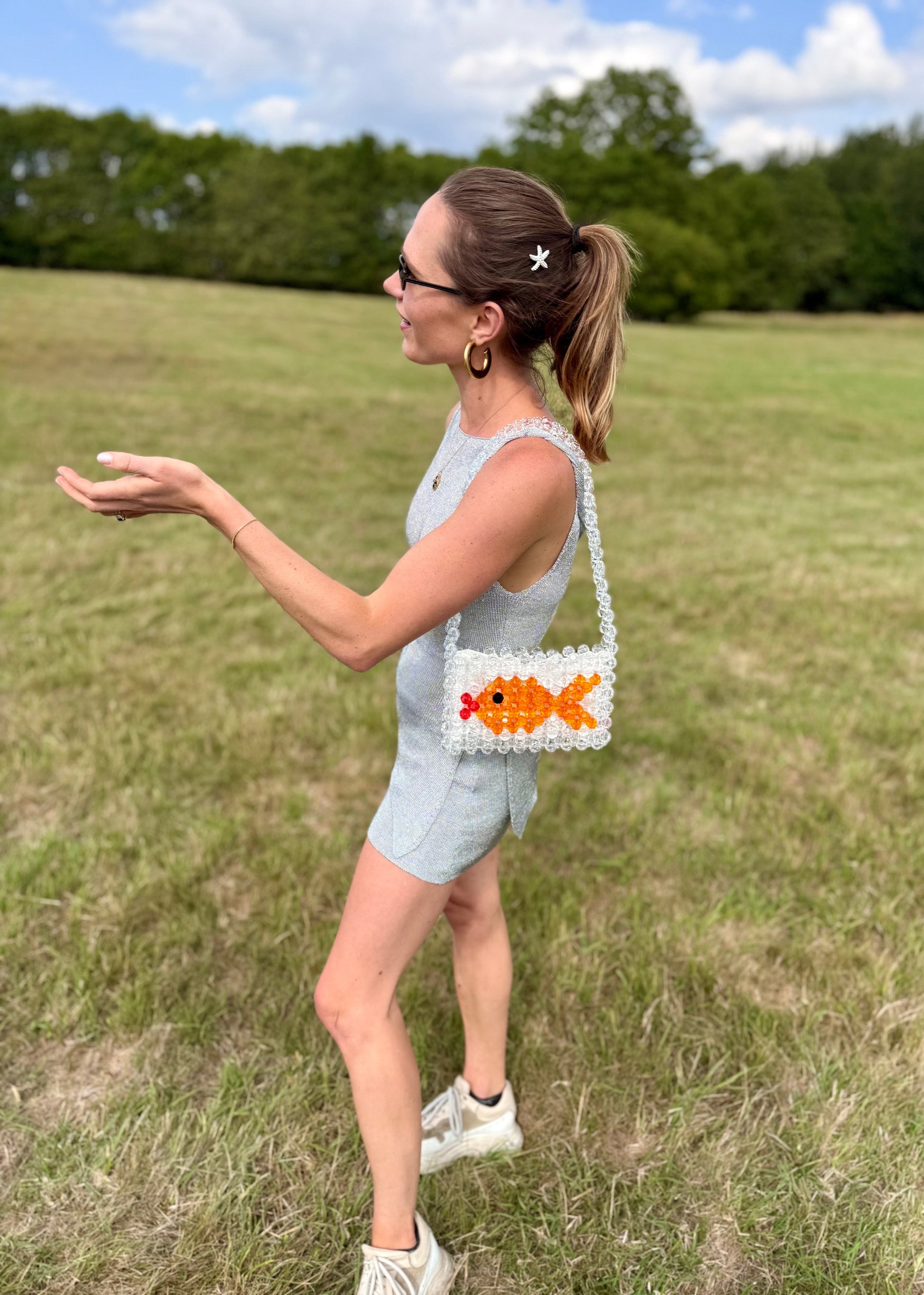Handcrafted with big transparent beads and a unique fishy icon, this bag is designed to be ICONic. If you want a different colour, please get in touch.